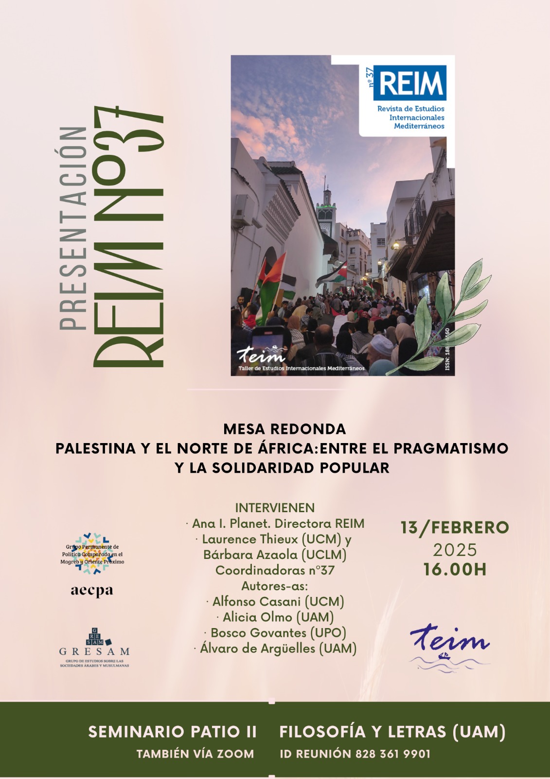 En colaboración con el grupo permanente MENA-AECPA y con la ocasión de la publicación del número 37 de la REIM "Palestina y el norte de África: entre el pragmatismo de los Estados y la solidaridad popular con la causa palestina" se va a organizar una mesa redonda en la UAM, el día 13 de febrero de 2025 de 16:00 a 18:00 con la presencia de las editoras y de un grupo de autoras. Híbrido: presencial y zoom