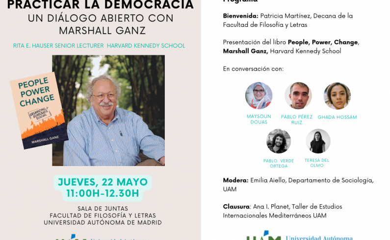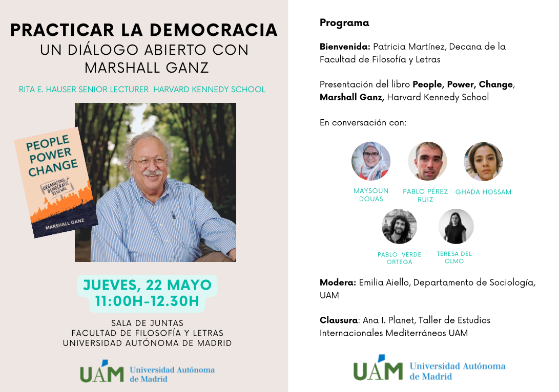 El pasado 22 de mayo de 2025, la Facultad de Filosofía y Letras de la Universidad Autónoma de Madrid acogió el encuentro “Practicar la democracia: un diálogo abierto con Marshall Ganz”, organizado en la Sala de Juntas de la facultad. La actividad giró en torno a la presentación del libro "People, Power, Change" y ofreció un espacio de reflexión sobre el papel de la acción colectiva, el liderazgo cívico y la organización social en los procesos democráticos.